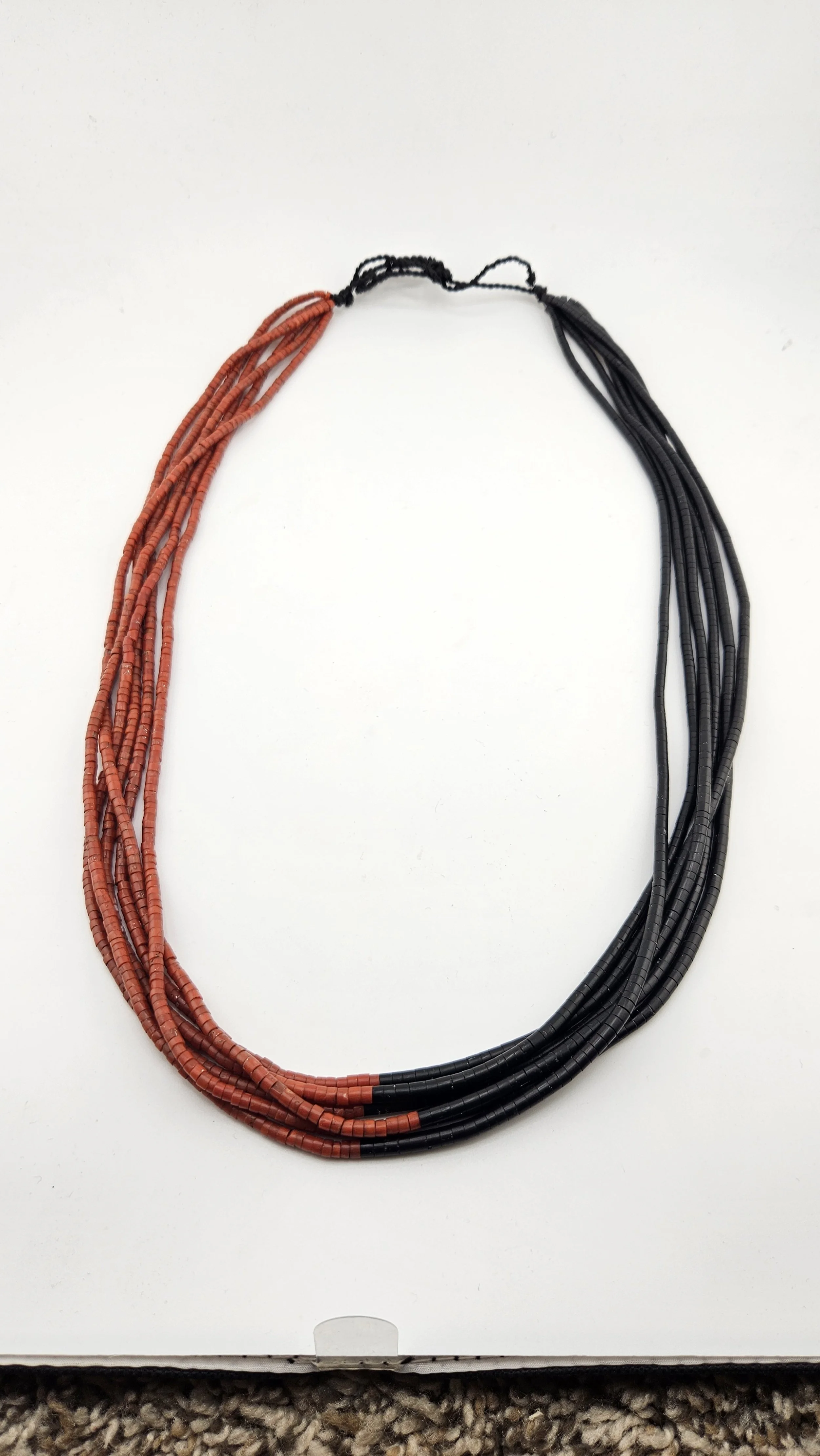 Image 1 of 1 Coral and Jet Heishi Necklace $2,200.00 6 strands of handrolled Mediterranean Coral and Jet28” of beads Add To Cart Added! 6 strands of handrolled Mediterranean Coral and Jet28” of beads