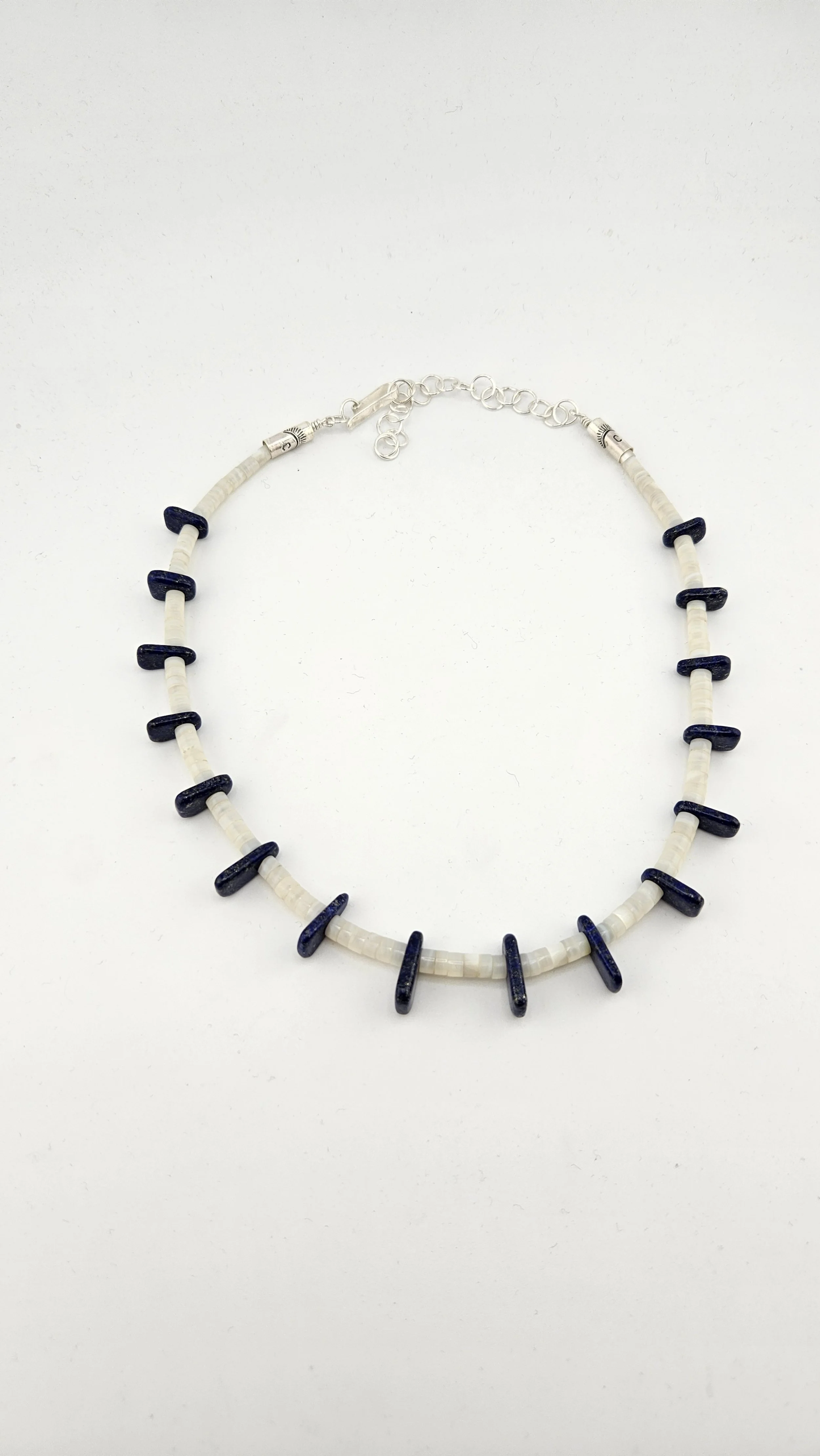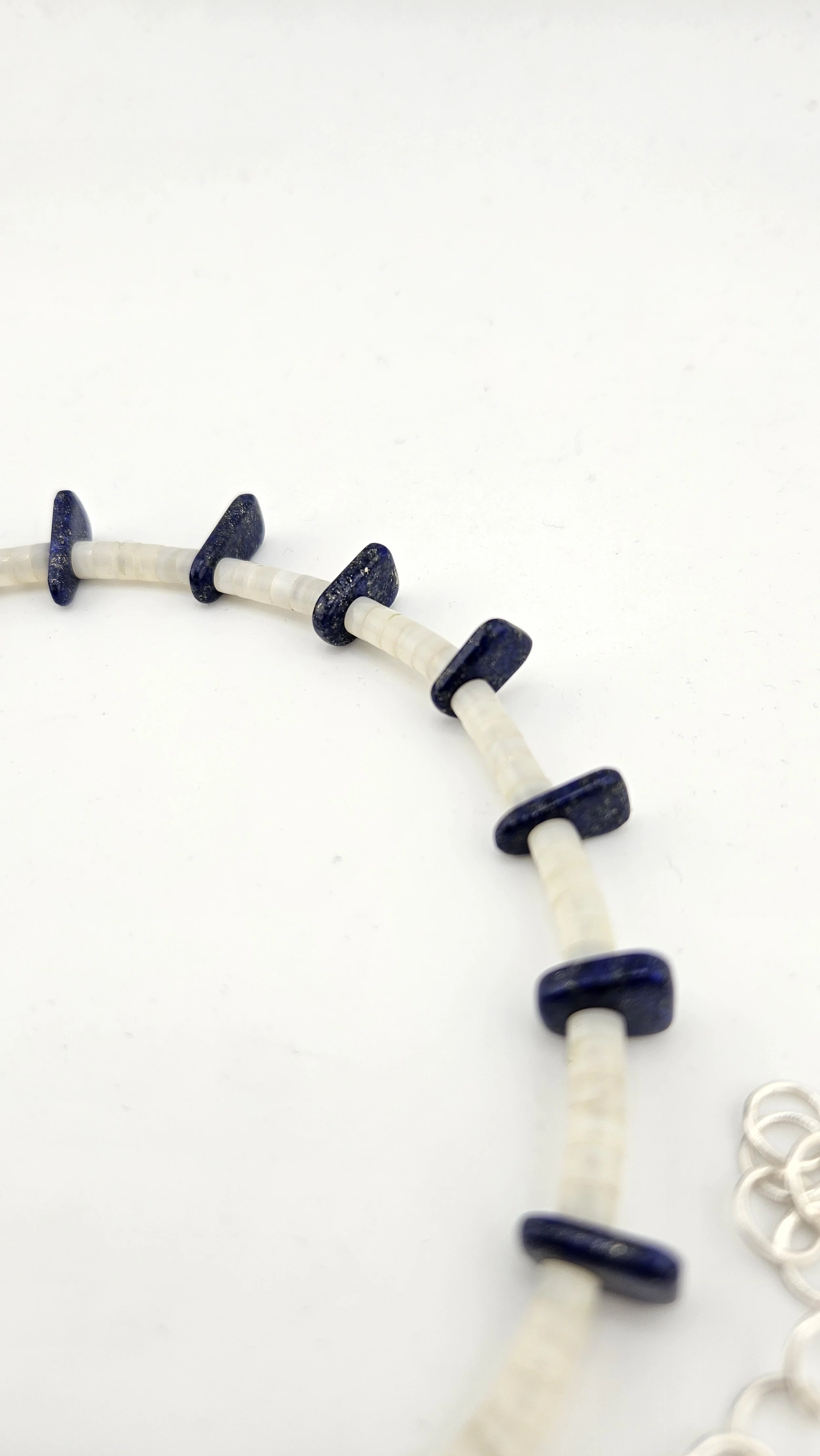 Mother of Pearl heishi with Lapis Lazuli tabs. Hand-rolled and shaped beads with hand-fabricated sterling silver parts. Adjustable from 16 - 20”