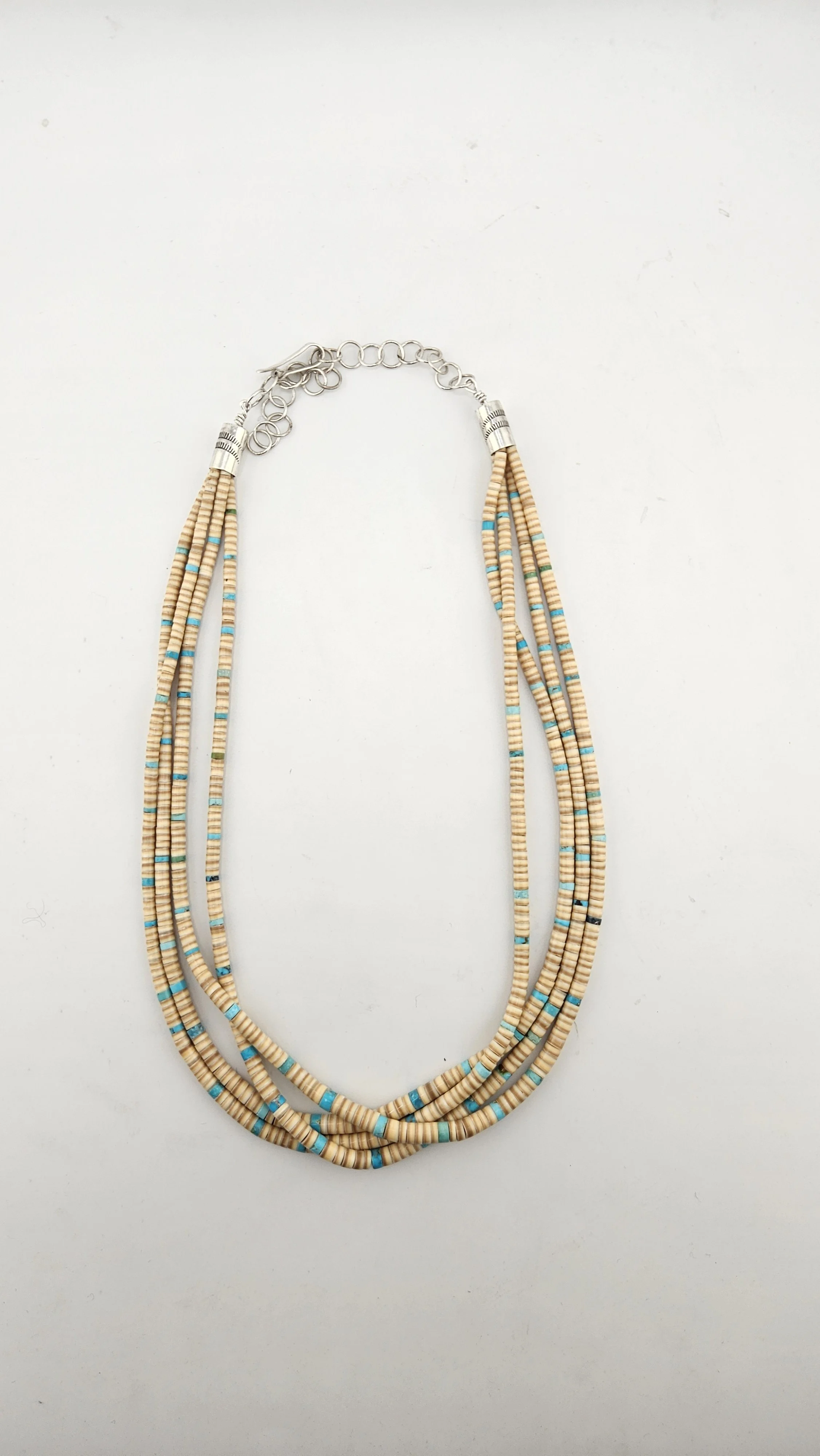 Image 1 of 1 Melon Shell and Smokey Valley Turquoise Necklace $900.00 4 strandsAdjustable from 17.5 - 21.5” Add To Cart Added! 4 strandsAdjustable from 17.5 - 21.5”