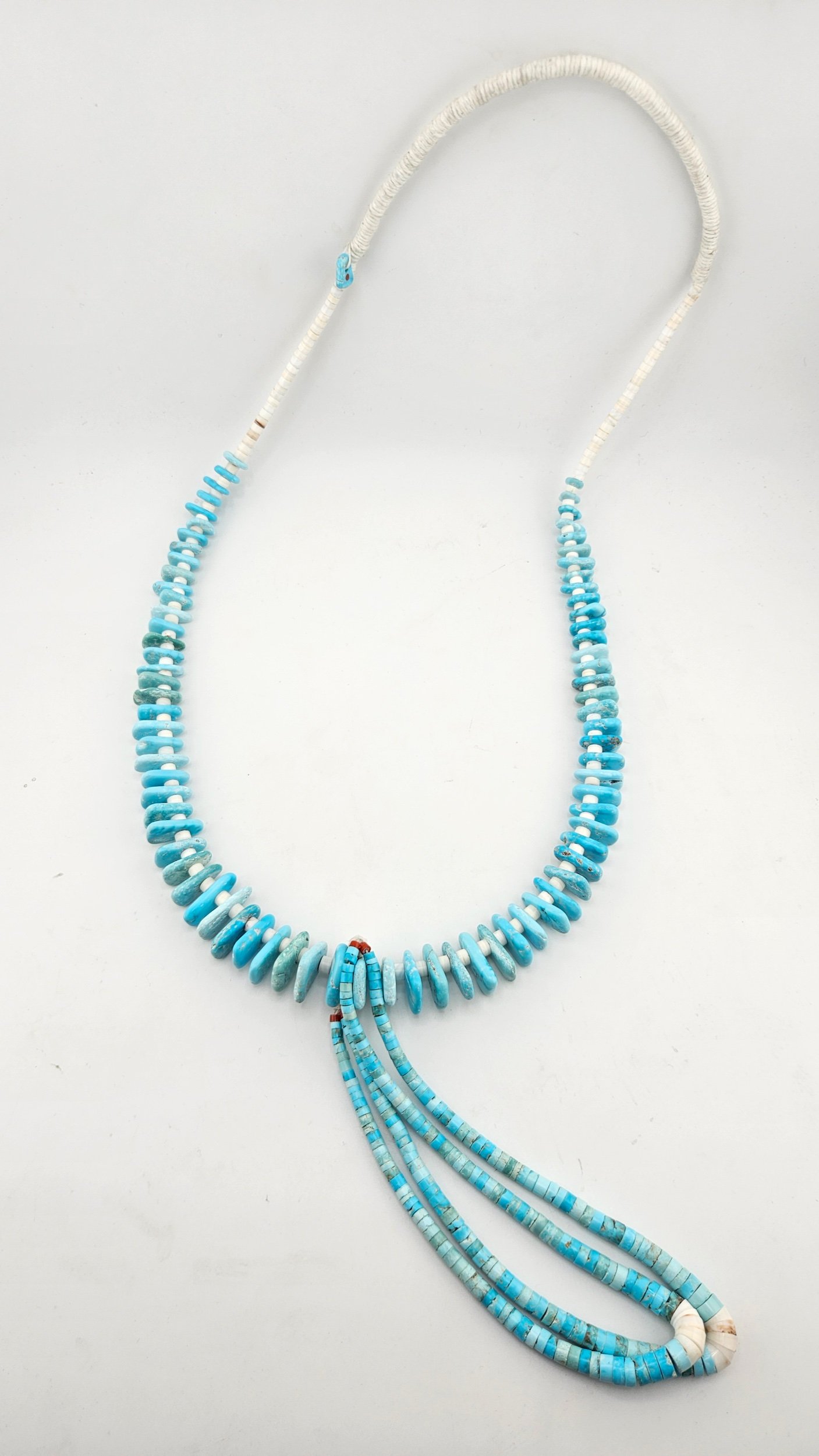 Image 1 of 1 Gecko Tab Necklace Sale Price: $3,000.00 Original Price: $3,500.00 Natural Gecko turquoise with glycemeris shell heishi and corns. Necklace is 32” and the jaatl’ool is 5” Add To Cart Added! Natural Gecko turquoise with glycemeris shell heishi and corns. Necklace is 32” and the jaatl’ool is 5”