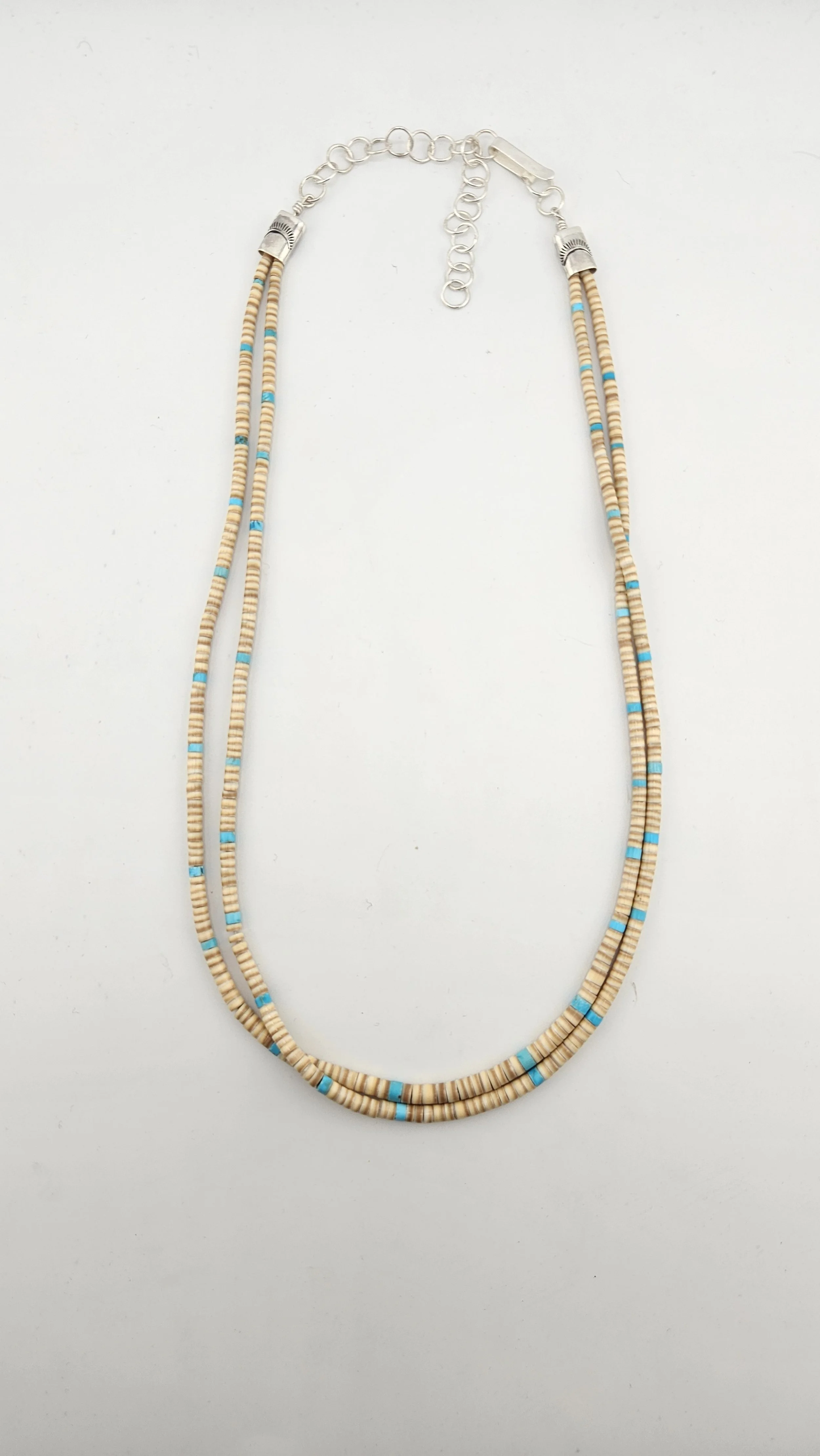 Image 1 of 1 Melon Shell and Lone Mountain Necklace $550.00 Handrolled melon shell and natural Lone Mountain turquoise heishi. Adjustable from 19.5 - 23” Add To Cart Added! Handrolled melon shell and natural Lone Mountain turquoise heishi. Adjustable from 19.5 - 23”
