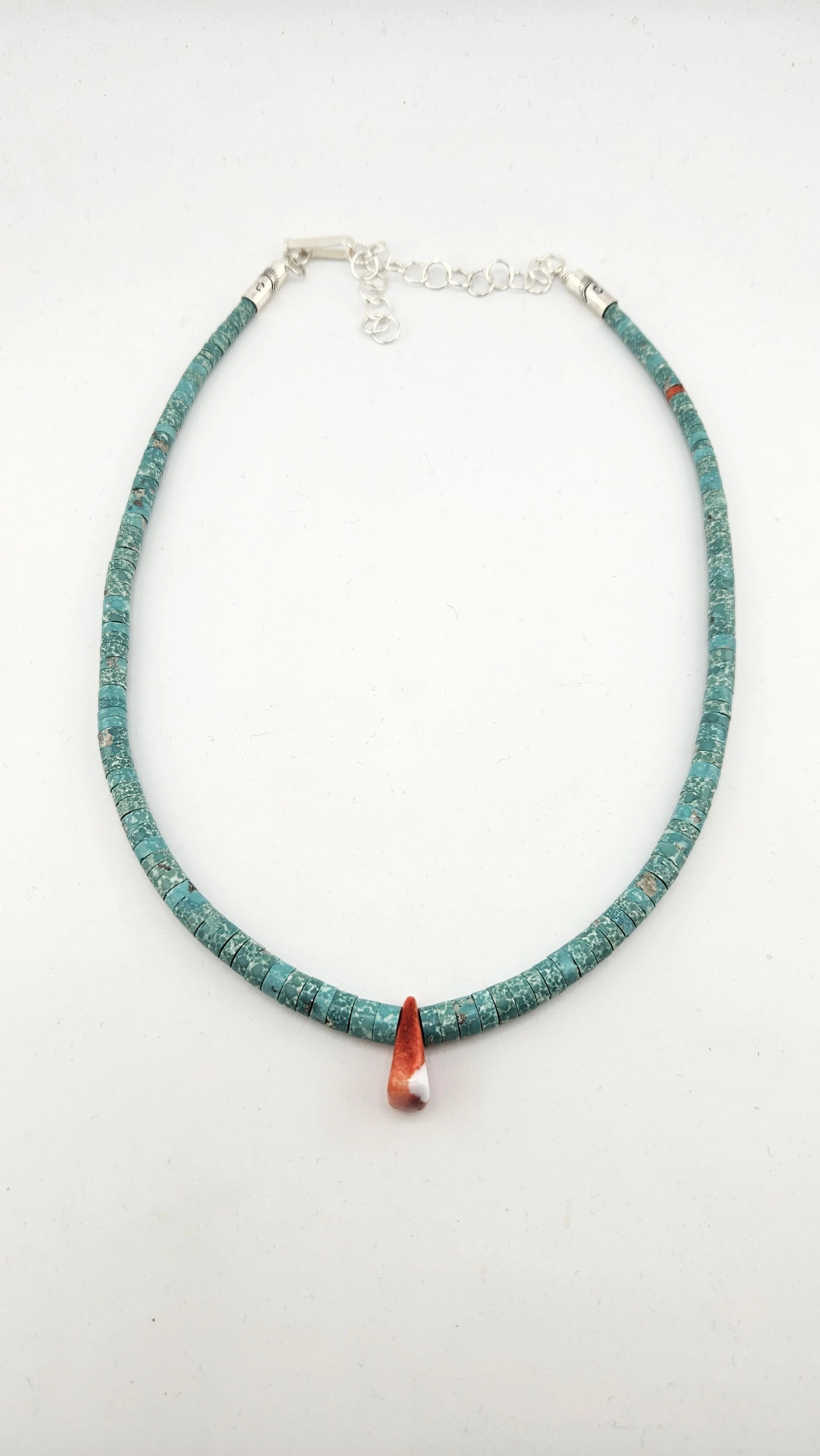 Image 1 of 1 Mongolian Heishi Necklace $500.00 Zachary treated Mongolian Turquoise and Spiny Oyster shell. Adjustable from 18 - 22” Add To Cart Added! Zachary treated Mongolian Turquoise and Spiny Oyster shell. Adjustable from 18 - 22”